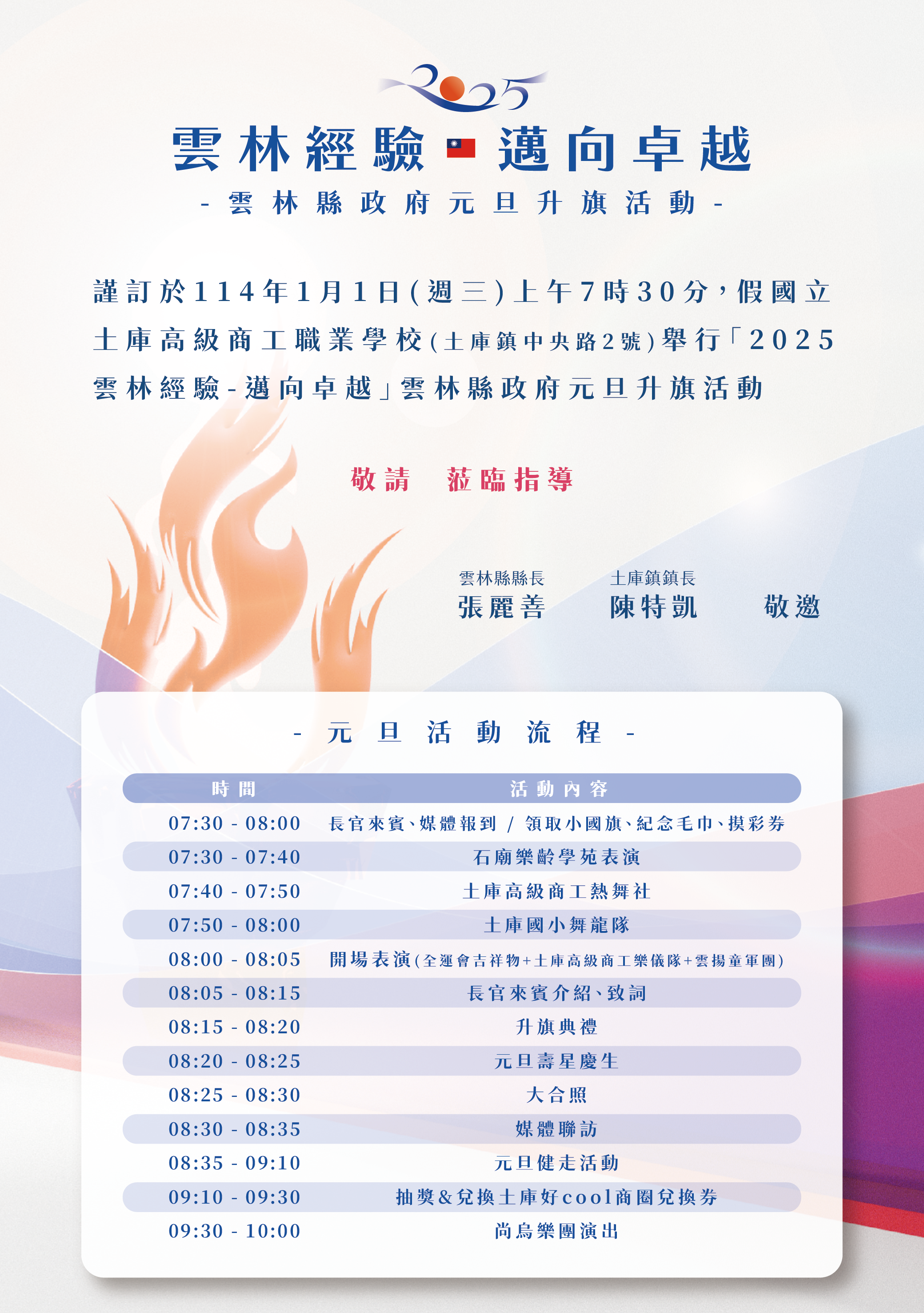 雲林縣政府將於本校舉辦元旦升旗典禮,本校協助提供場地並參與活動。本次活動涉及多項事前籌備工作,需請教師協助配合。特此整理相關注意事項,敬請參閱並協力完成,感謝您的協助與配合!