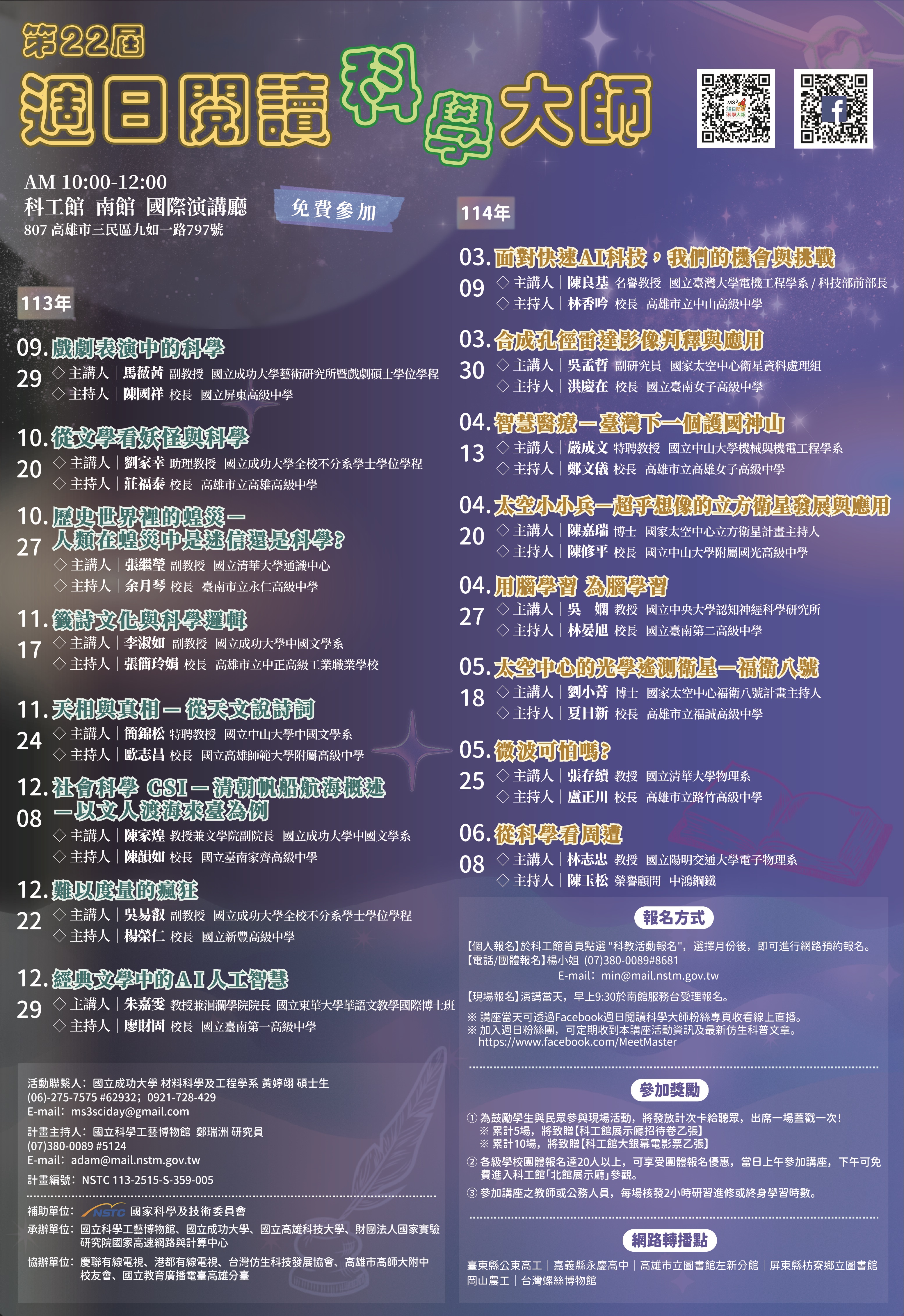 公告內容 轉知國立科學工藝博物館辦理「第22屆週日閱讀科學大師」系列科普講座