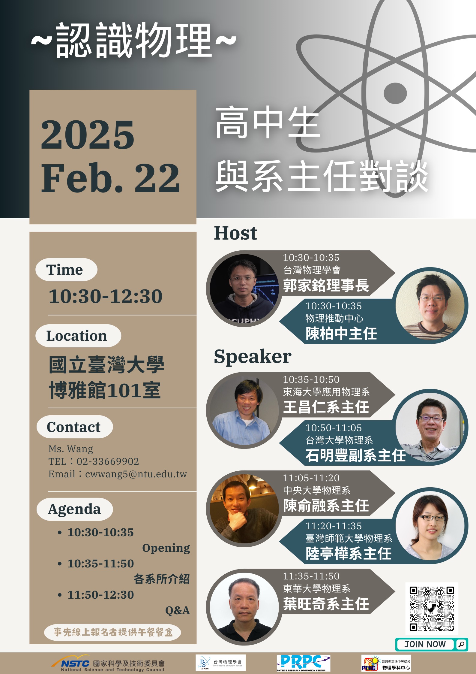 主旨 轉知社團法人台灣物理學會辦理「~認識物理~高中生與系主任對談」座談活動