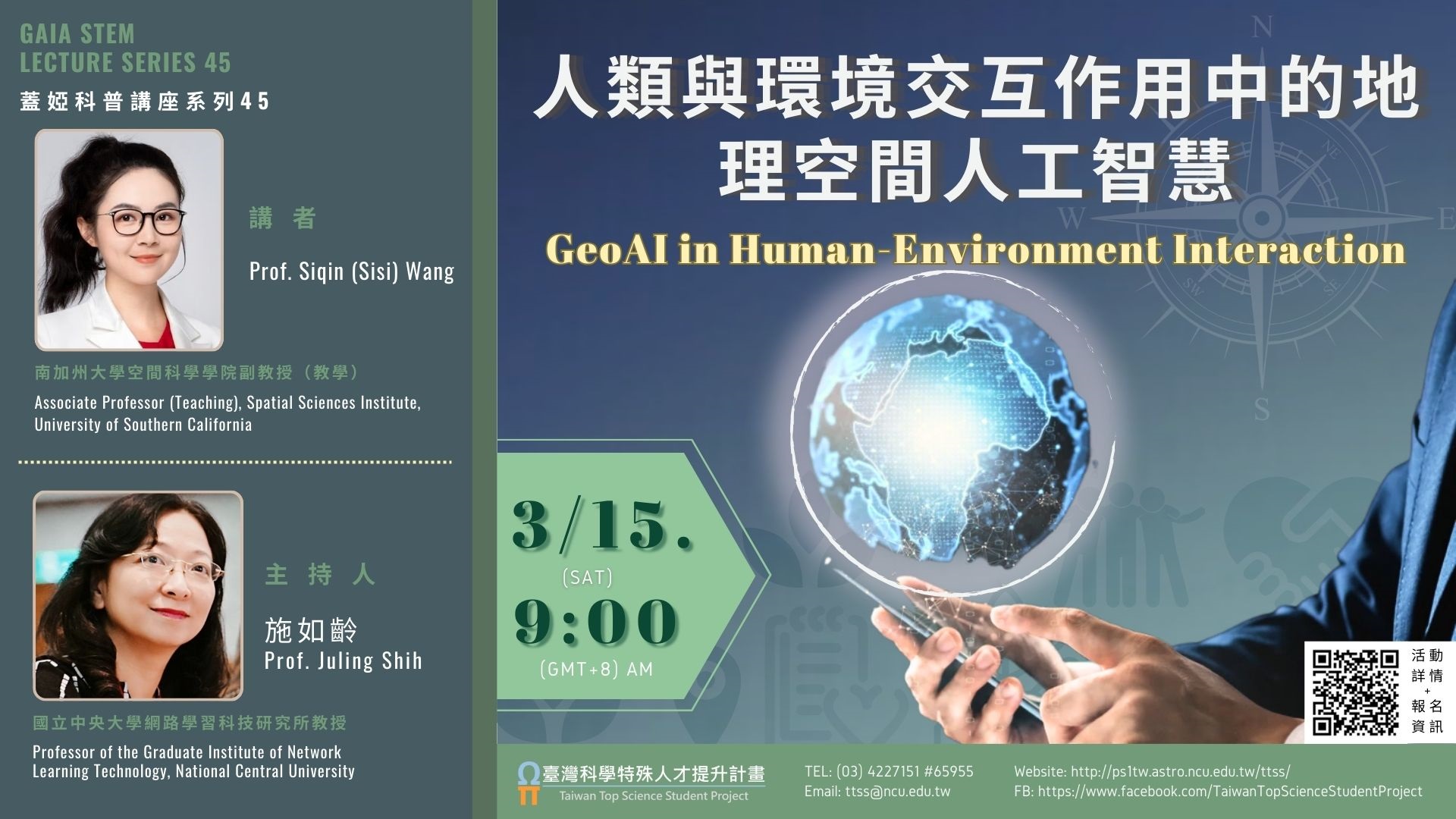 主旨 轉知國立中央大學辦理線上講座:《蓋婭科普講座系列45》——「人類與環境交互作用中的地理空間人工智慧」