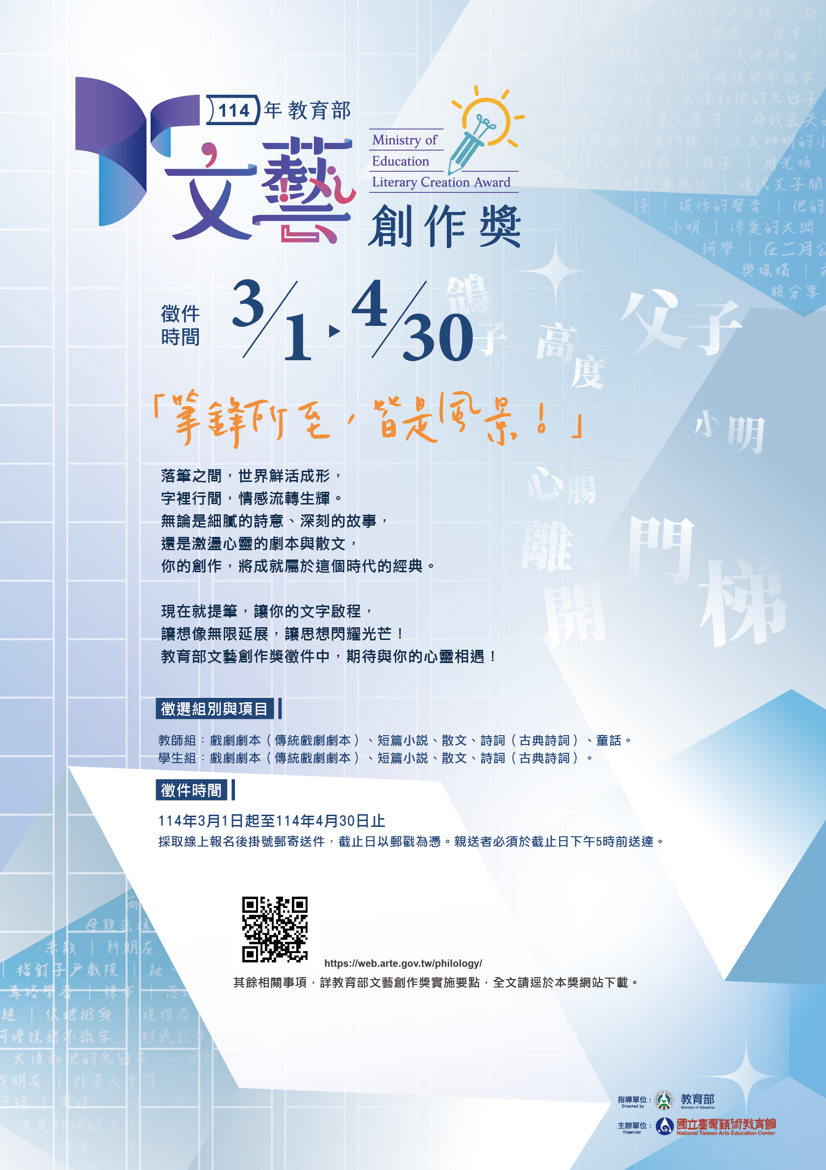 主旨:有關114年教育部文藝創作獎自本(114)年3月1日起開始徵件,請惠予協助宣傳並鼓勵所屬踴躍參加,詳如說明,請查照轉知。