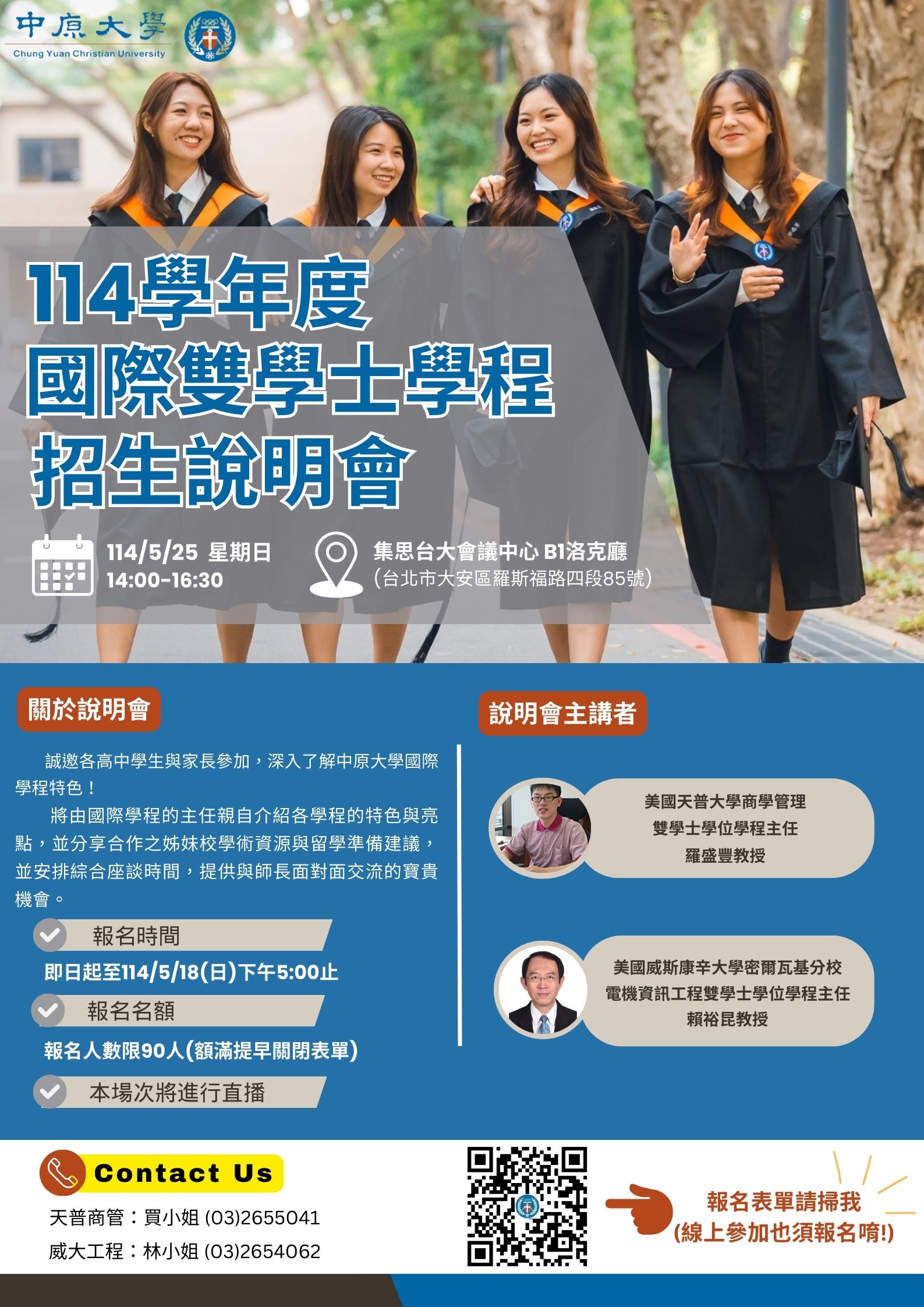 公告內容 主旨:檢送本校辦理「中原大學國際雙學士學位學程」114學年度招生說明會(加開場)海報1份,邀請貴校升學輔導相關教師參加,鼓勵貴校學生及家長踴躍報名,請查照並惠予公告周知。