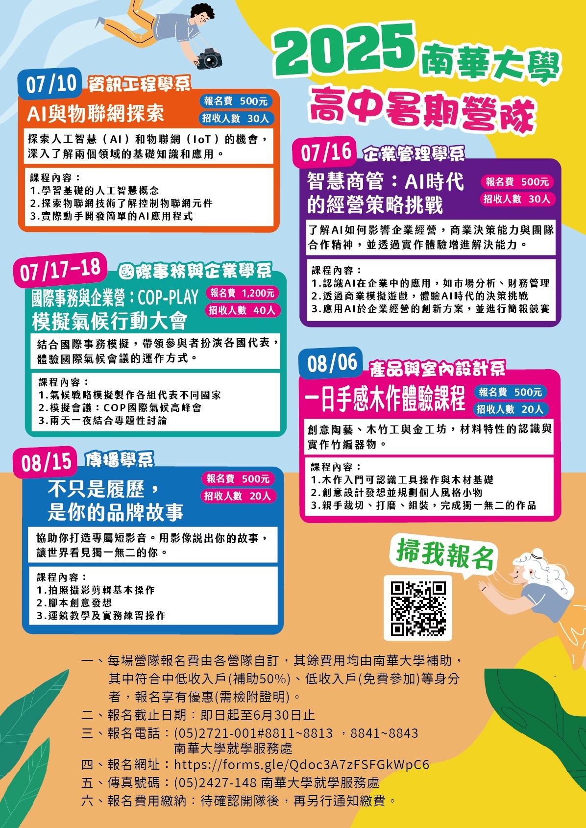 主旨 轉知南華大學辦理「2025暑假高中生營隊活動資訊一覽表」