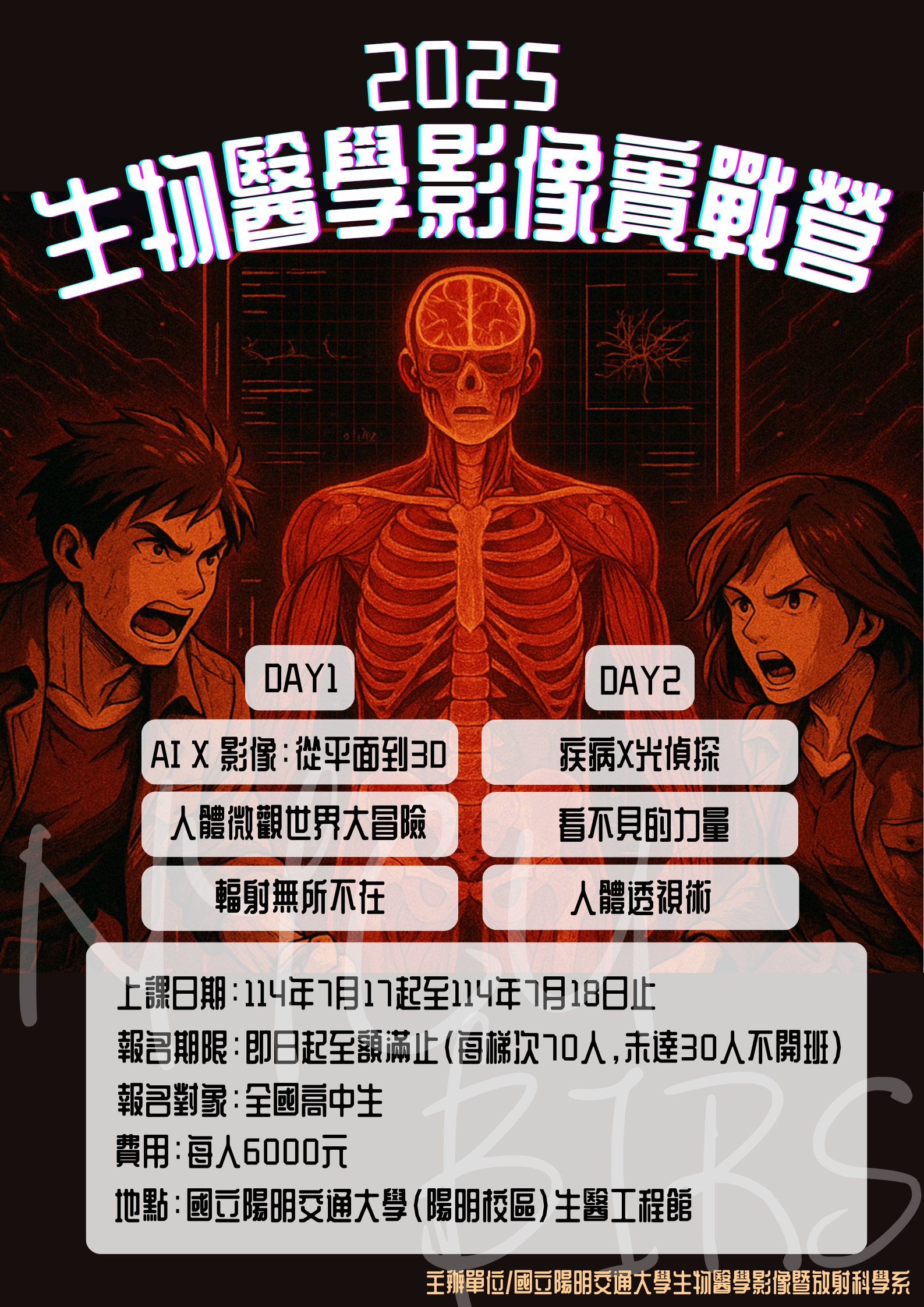 公告內容 轉知國立陽明交通大學生物醫學工程學院生物醫學影像暨放射科學系辦理之「2025生物醫學影像實戰營」第一梯次活動相關資訊