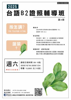 (一)台語B2證照輔導班第4期,2025/10/18-2026/1/24,每週六9-15點,共15次,優惠價13,800元(不含教材與午餐)。