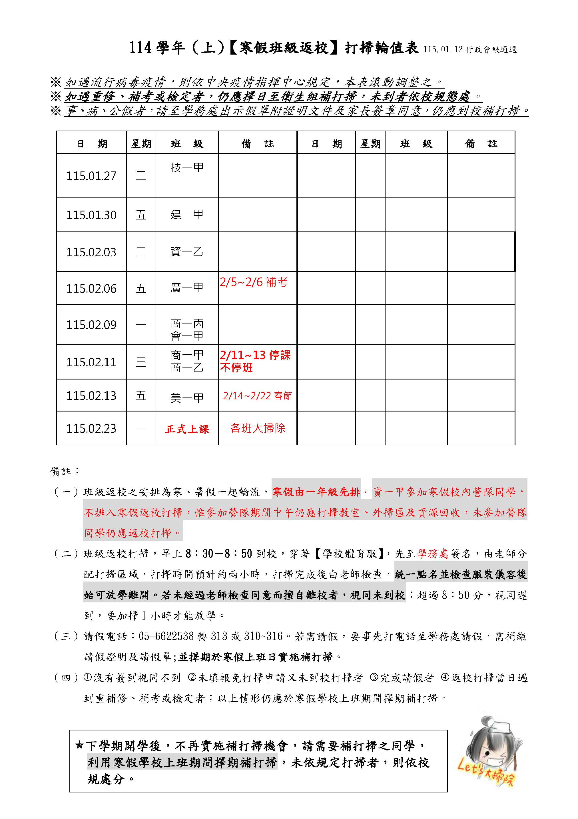 主旨 114學年(上)【寒假班級返校】打掃輪值表
