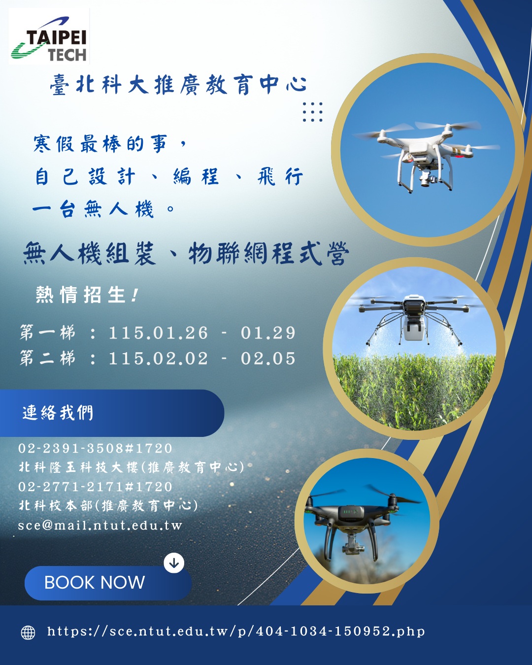 公告內容 轉知國立臺北科技大學進修部推廣教育中心預定於115年01月26日(第一梯)及115年02月02日(第二梯)起開辦【無人機組裝、物聯網程式營】課程