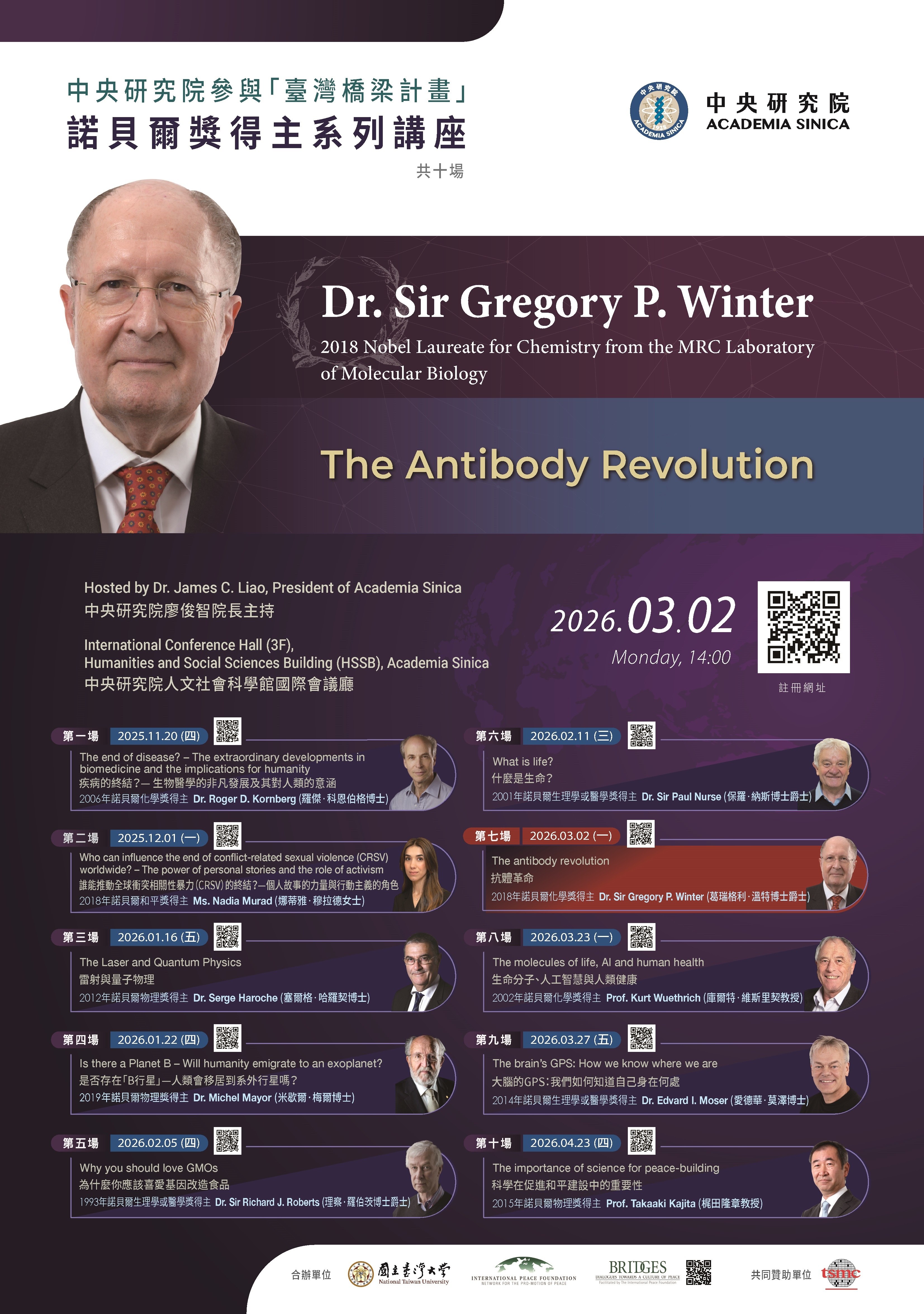 一、「臺灣橋梁計畫」自114年11月起至本(115)年4月,共將邀請 31 位諾貝爾獎得主訪問本院及全臺十餘所大學,相關資訊請參閱網站:https://www.peace-bridges.net/。